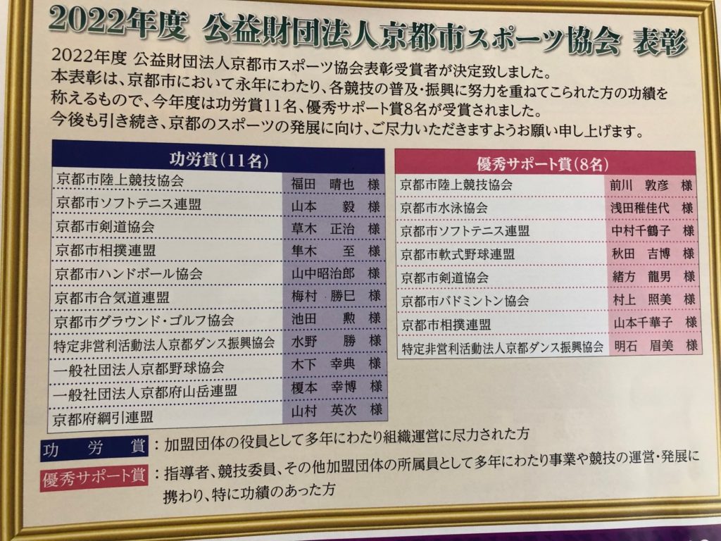 本年は、当協会の水野勝さんと明石眉美さんが(公財)京都市スポーツ協会から、長年のダンスへの取組と貢献などにより表彰されました。おめでとうございます。これからもダンスを楽しく踊っていきましょうね。